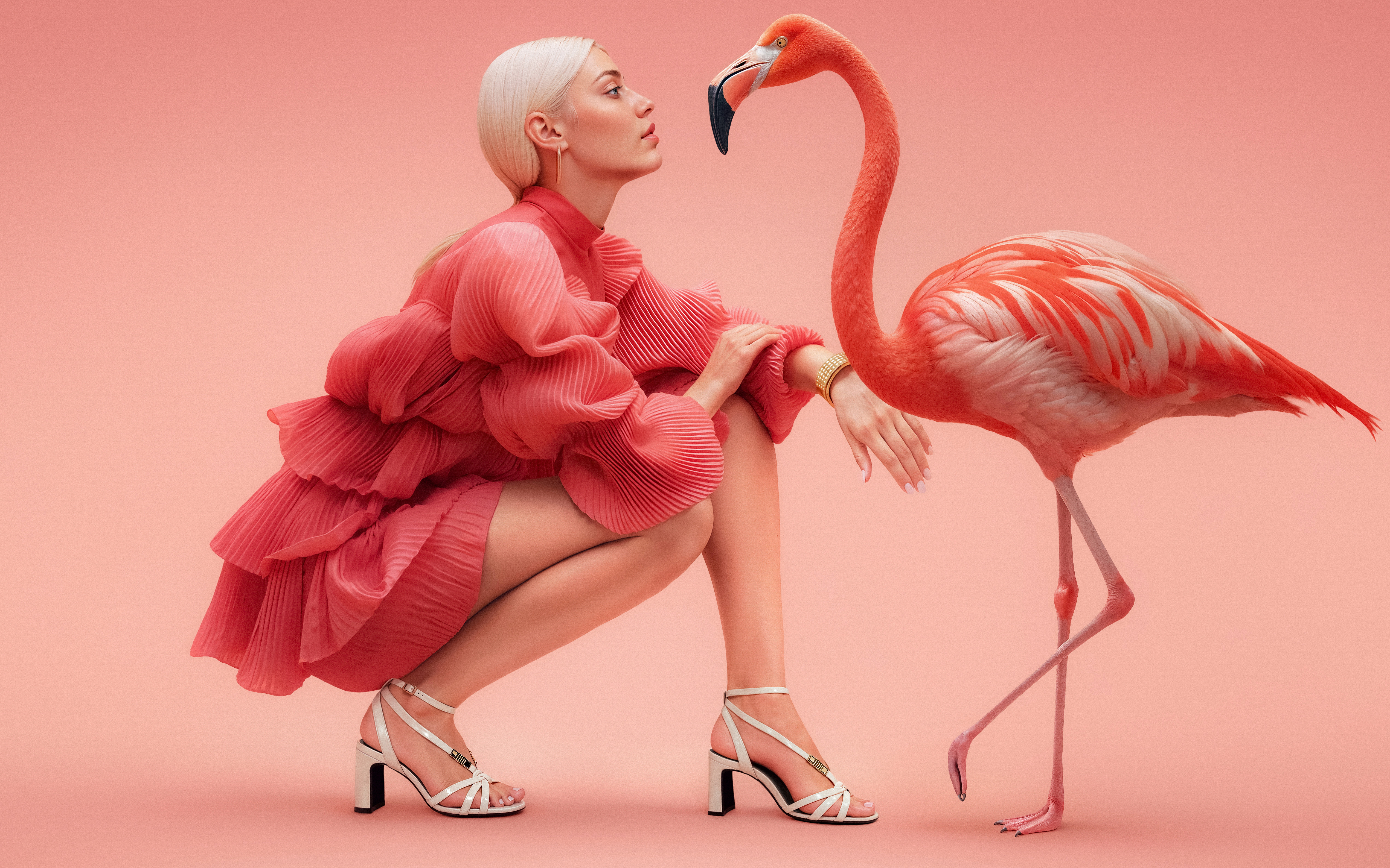 Com o conceito “O real é o que se sente”, o flamingo foi escolhido como metáfora de presença e elegância, traduzindo a beleza de quem encontra equilíbrio na própria essência. Cada imagem é resultado de um processo cuidadoso, que não se limitou a “comandos de IA”, mas envolveu escolhas de luz, cor, poses e até ajustes manuais para respeitar o corpo em movimento e a interação com o ambiente.